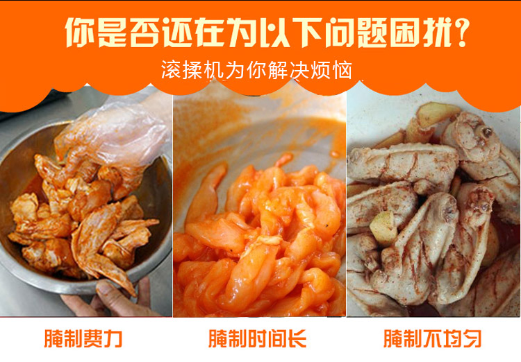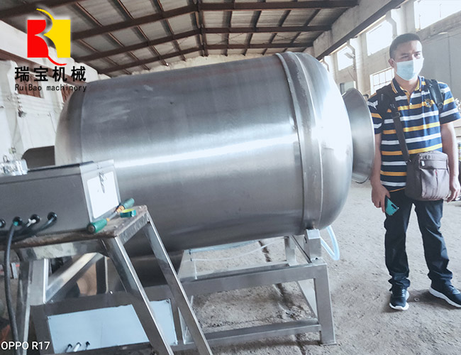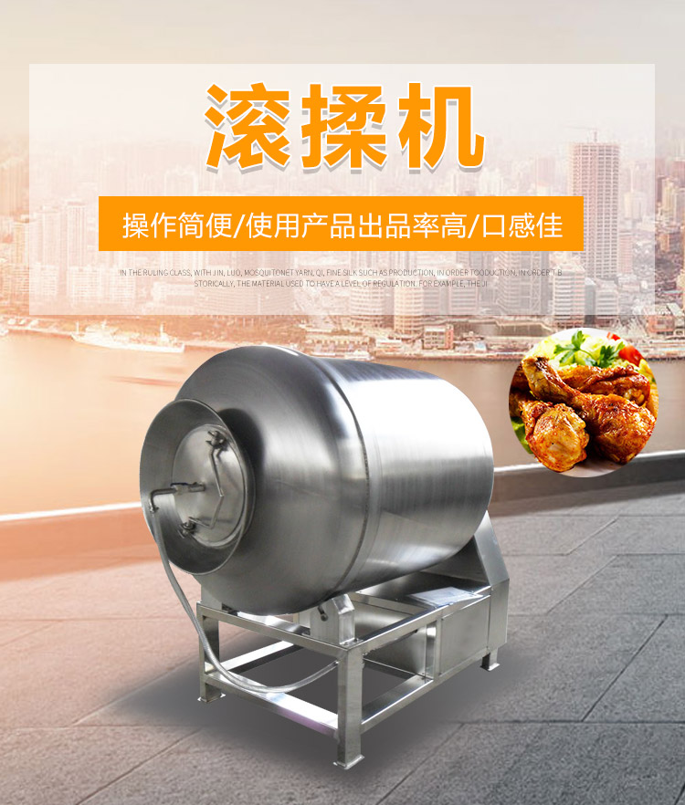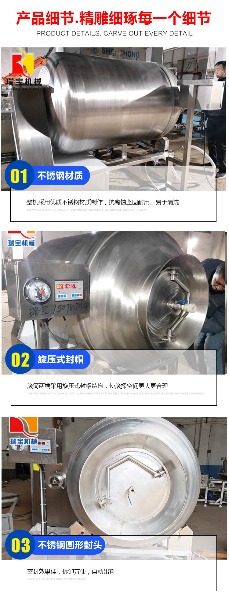 4.圓形封頭,結(jié)構(gòu)合理,滾揉空間大,運(yùn)行平穩(wěn)、噪音小,性能可靠、操作簡便、設(shè)備使用效率高。