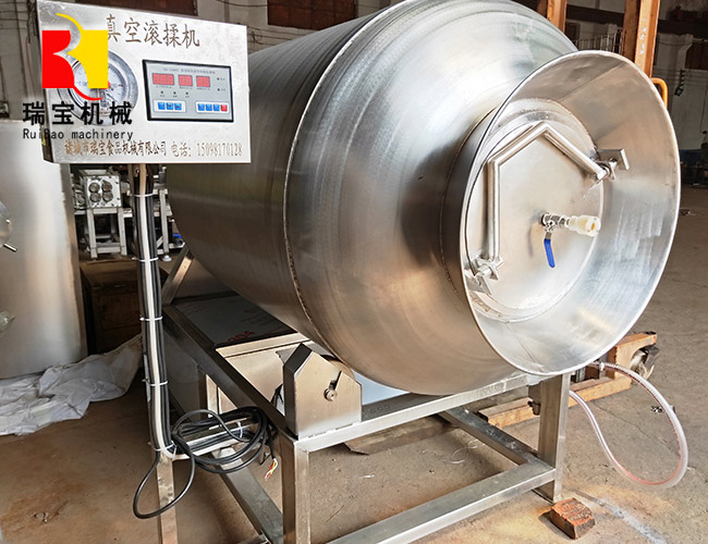真空滾揉機(jī)是在真空狀態(tài)下,利用物理沖擊原理,讓肉塊或肉餡在滾筒內(nèi)上下翻動(dòng),從而達(dá)到按摩、腌漬作用。腌漬液被肉充分吸收,增強(qiáng)肉的結(jié)合力和保水性,提高產(chǎn)品彈性及出品率。本機(jī)采用不銹鋼制作,圓形封頭,結(jié)構(gòu)合理,滾揉空間大,運(yùn)行平穩(wěn)、噪音小,性能可靠、操作簡便、設(shè)備使用效率高。槳葉圓弧形,設(shè)計(jì)特有,使腌料分布均勻,對(duì)產(chǎn)品表層不造成傷害,使產(chǎn)品的柔嫩性和外觀得到提高。